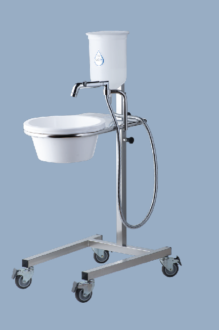 Alla tanica è collegato un tubo flessibile con rubinetto provvisto di levetta “apri- chiudi” che dà la possibilità di lavarsi in autonomia grazie ad un flusso continuo.